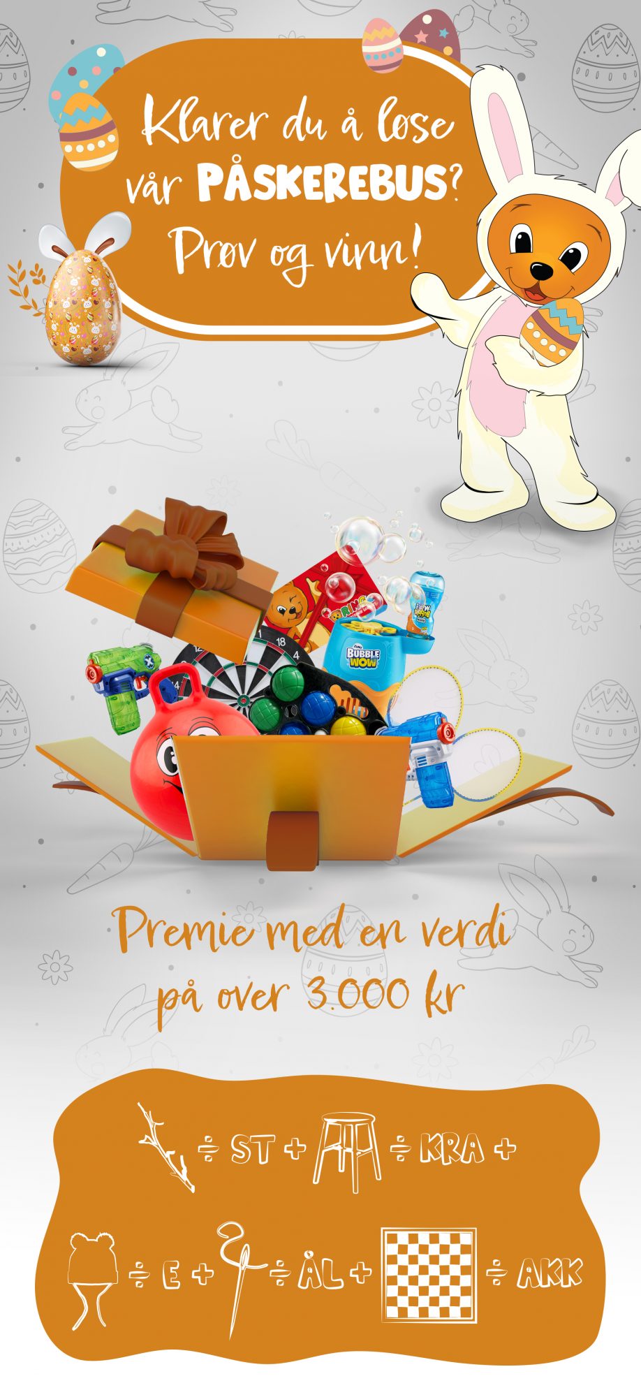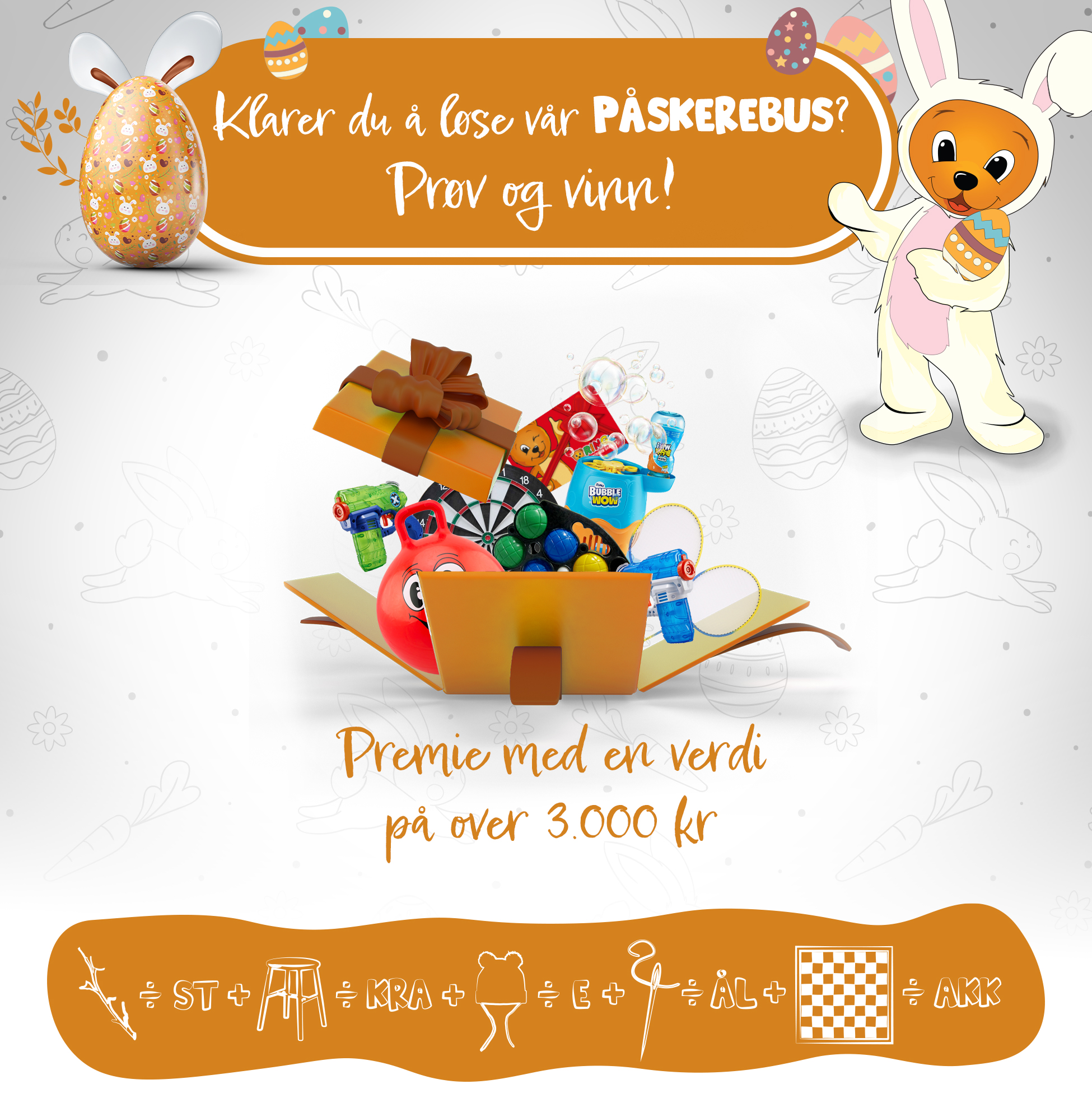 Løs påskerebusen, skriv svaret ditt i svarfeltet under og bli med i trekningen av en premie med verdi på over 3.000 kr! Konkurransen pågår ut 18. april. Vinner trekkes 19. april.