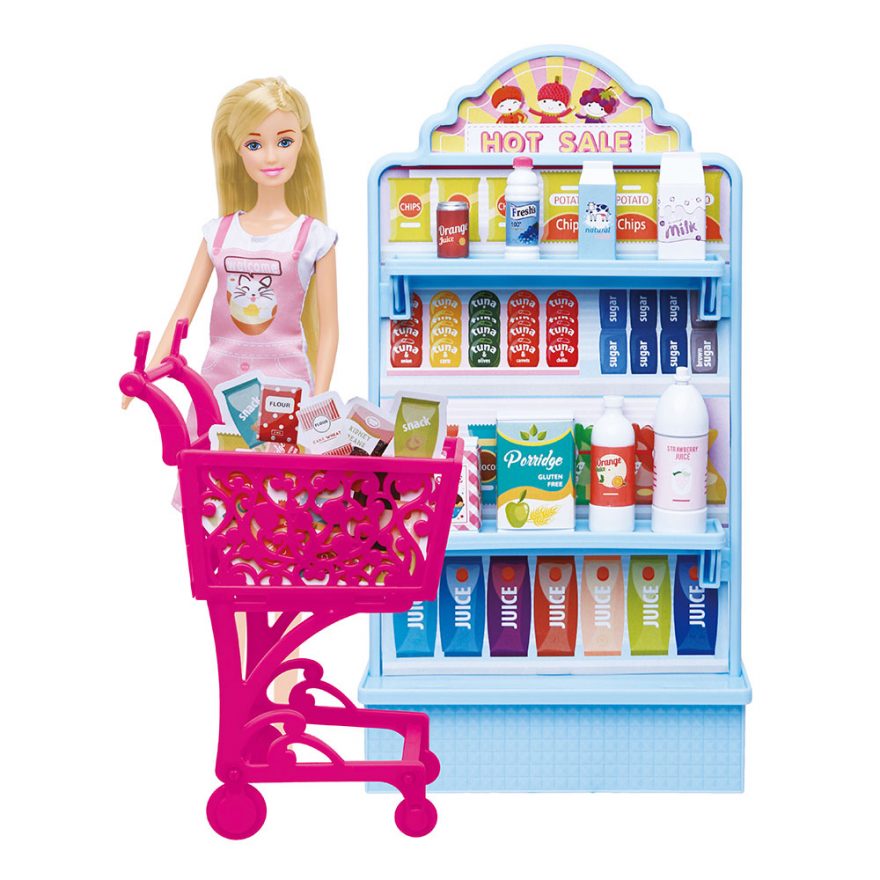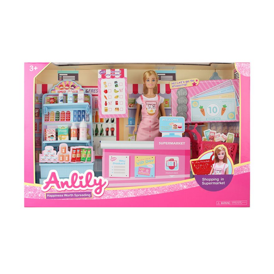 Dette settet inkluderer alt du trenger for en handletur med Anlily, som matvarer, penger, shoppingvogn og kasse.