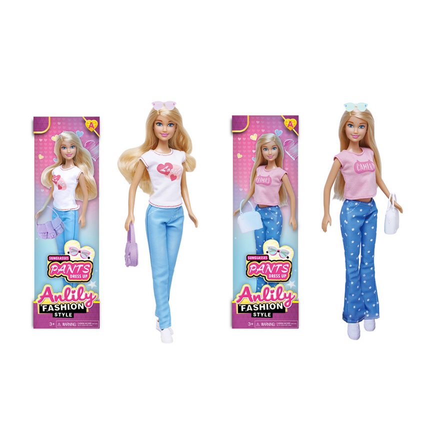Anlily motedukke med fashionabel outfit, veske og solbriller. Dukkes fåes i to varianter. Selges assortert.