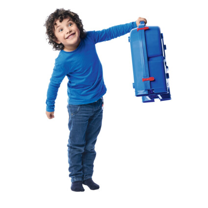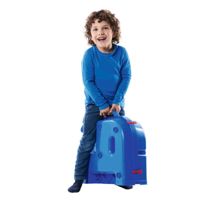 La oss introdusere AquaPlays bestselger, den bærbare SlussBoxen! Flodhesten Wilma er den selvutnevnte kapteinen på containerbåten som ved hjelp av pedalen settes i gang og beveger kjøretøyene fremover i kanalene. Vannivået i låsen reguleres ved hjelp av pumpen og låseportene. I havnen kan du bruke den manuelle kranen til å laste containeren på den amfibiske bilen. Kjør deretter via rampen og broen ned bakken for å losse varene.