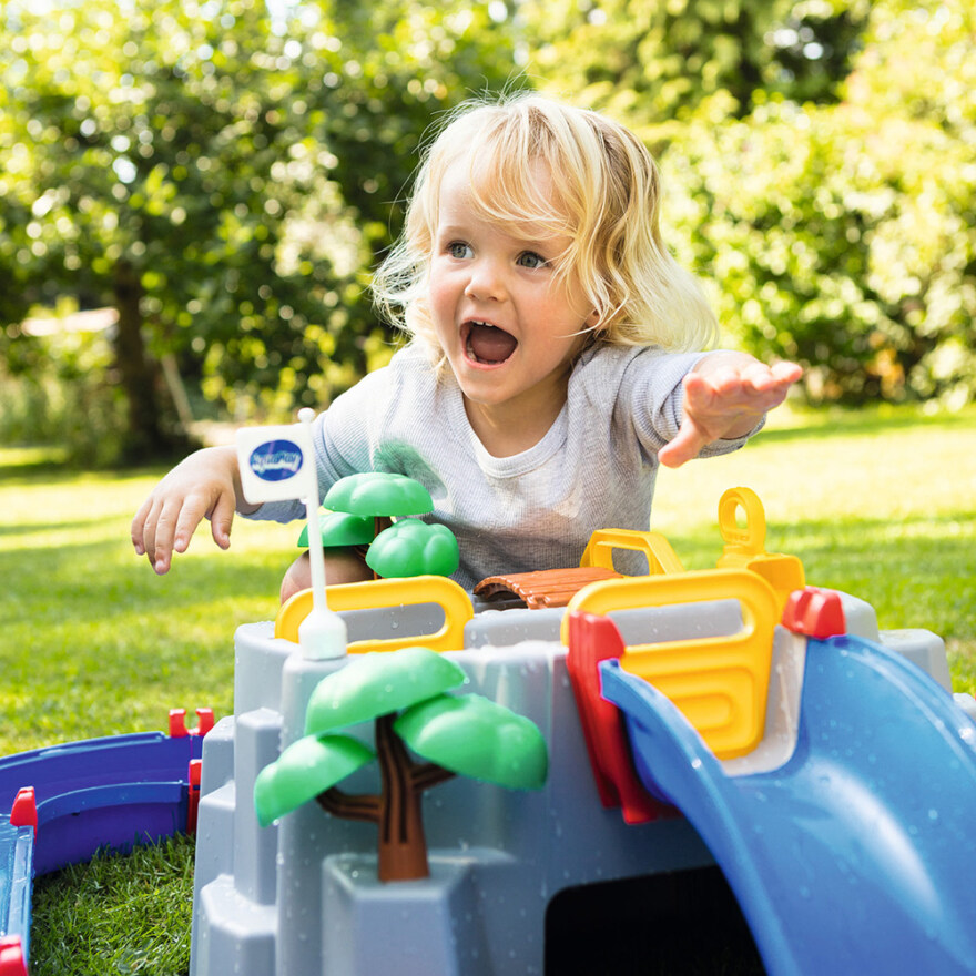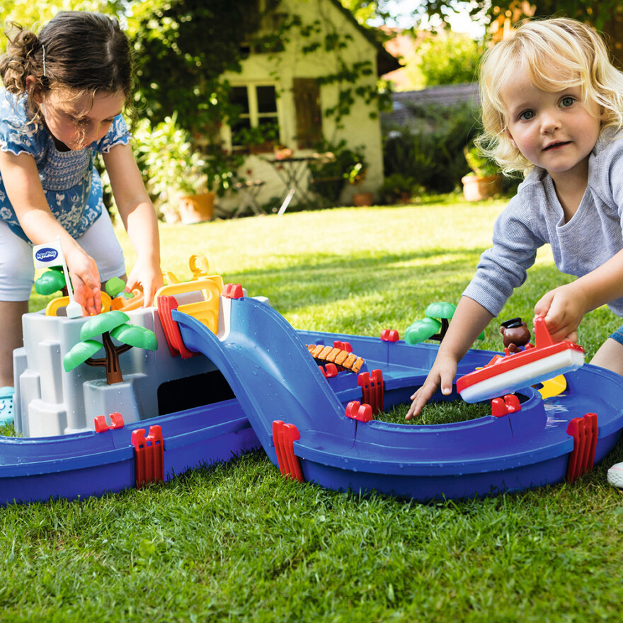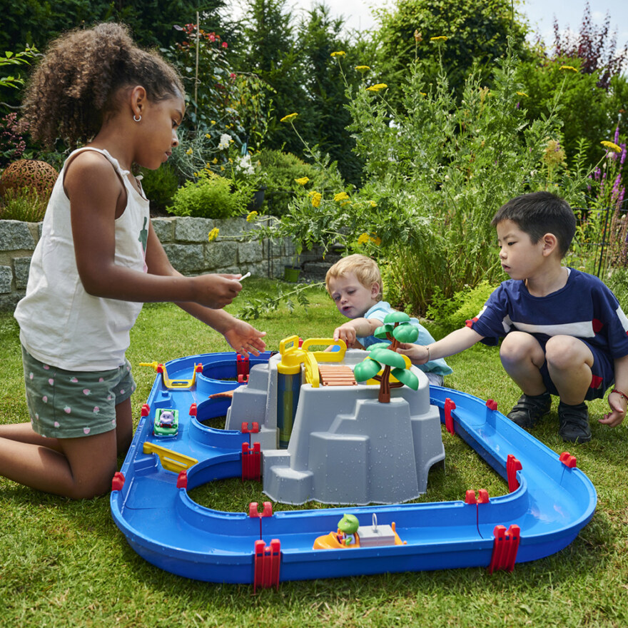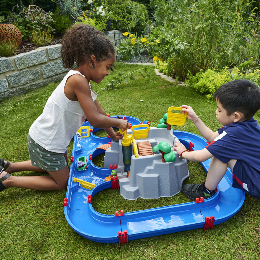 Møt AquaPlays Mountain Lake! Dette store kanalsystemet vil oppta barna i mange timer med den splitter nye lekeattraksjonen; høyfjellet med en innsjø på toppen. Settet inkluderer en hurtigbåt, en containerbåt med en container og tre figurer; frosken Nils og bjørnen Bo. Sammen med karakterene kan barna utforske fjellets mystiske hule, klatre opp de bratte klippene, ta hurtigbåten nedover den sildrende fossen eller se etter skatter i kanalene. Sett vannet i bevegelse ved å sveive pedalen og kjøre videre mot låsen. Der reguleres vannstanden ved hjelp av pumpen og låseportene.