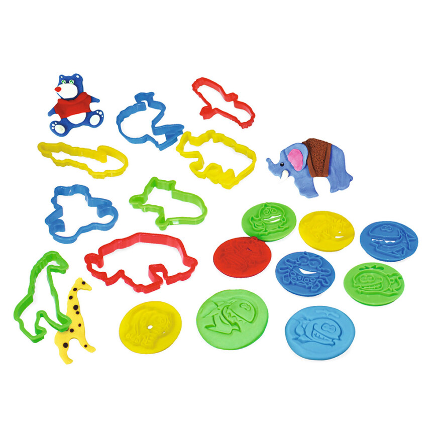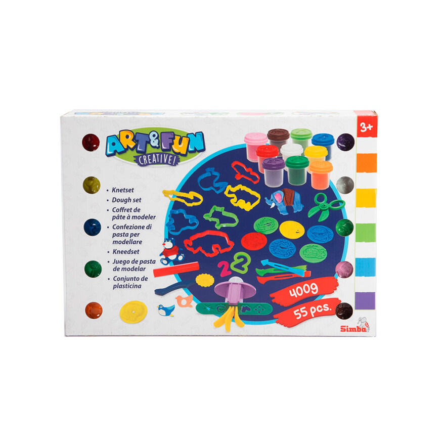 Stort sett med lekeleire fra Art & Fun. Inneholder 10x40 g lekeleire, former og mer tilbehør.
