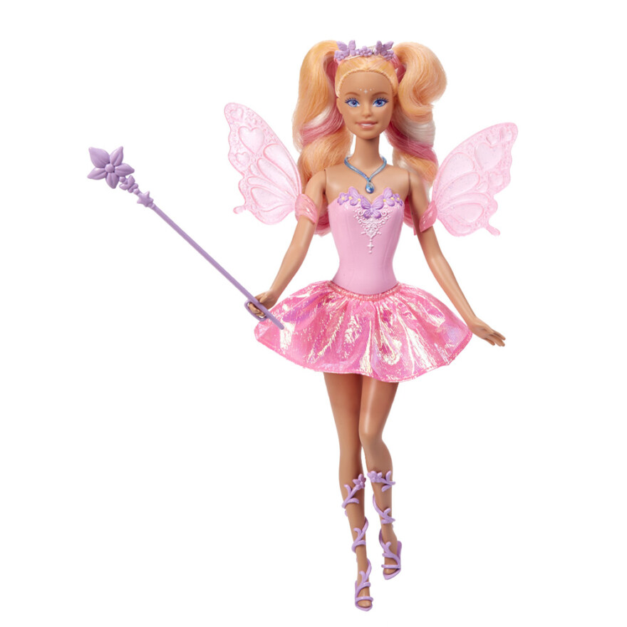 - Inkluderer: Barbie fe-dukke, stjerneformet svampstav, skimrende kjole, vinrankesko, sommerfugl-hodebånd, vanndråpe-halskjede