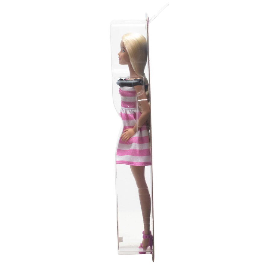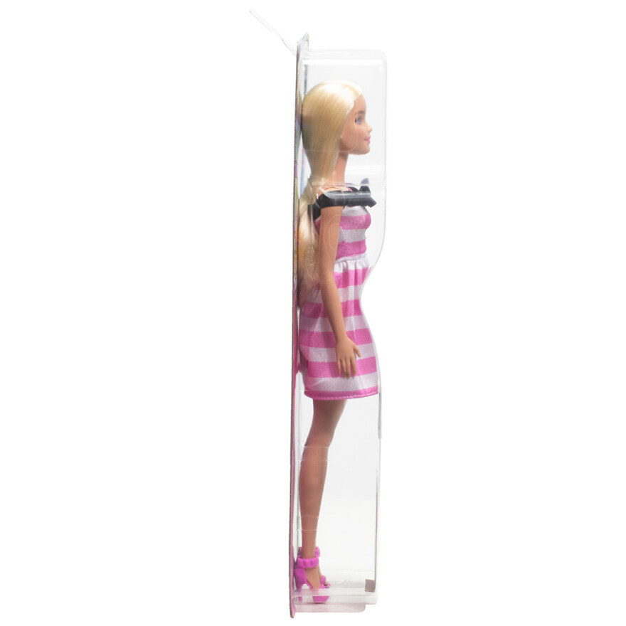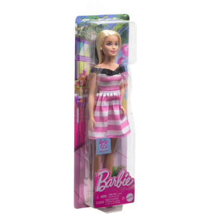 Feire Barbies 65-årsjubileum med denne minnedukke. Hun er kledd i en kjole med rosa og hvite striper med en svart sløyfedetalj i halsen. Stilen blir komplett med perleøredobber og rosa sko med høye hæler! Denne dukken er en flott gave til barn og Barbie-fans i alle aldre.
