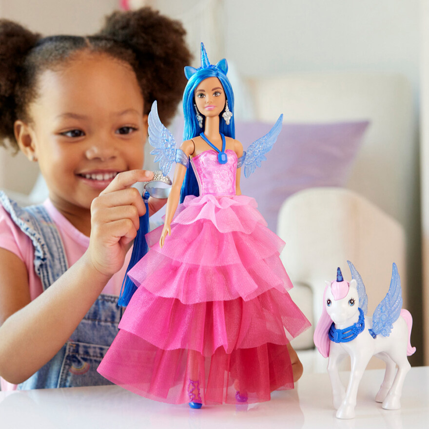 Barna kan feire Barbies 65-årsjubileum med en fortryllende dukke! Den flotte enhjørningdukken med vinger er inspirert av karakteren i Barbie: A Touch of Magic. Hun er kledd i en flott kjole i rosa nyanser. I det blå håret har hun en enhjørninghårbøyle, mens vingene på armene og den avtagbare halen gir den et ekstra fantasifullt preg.