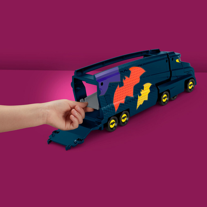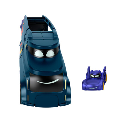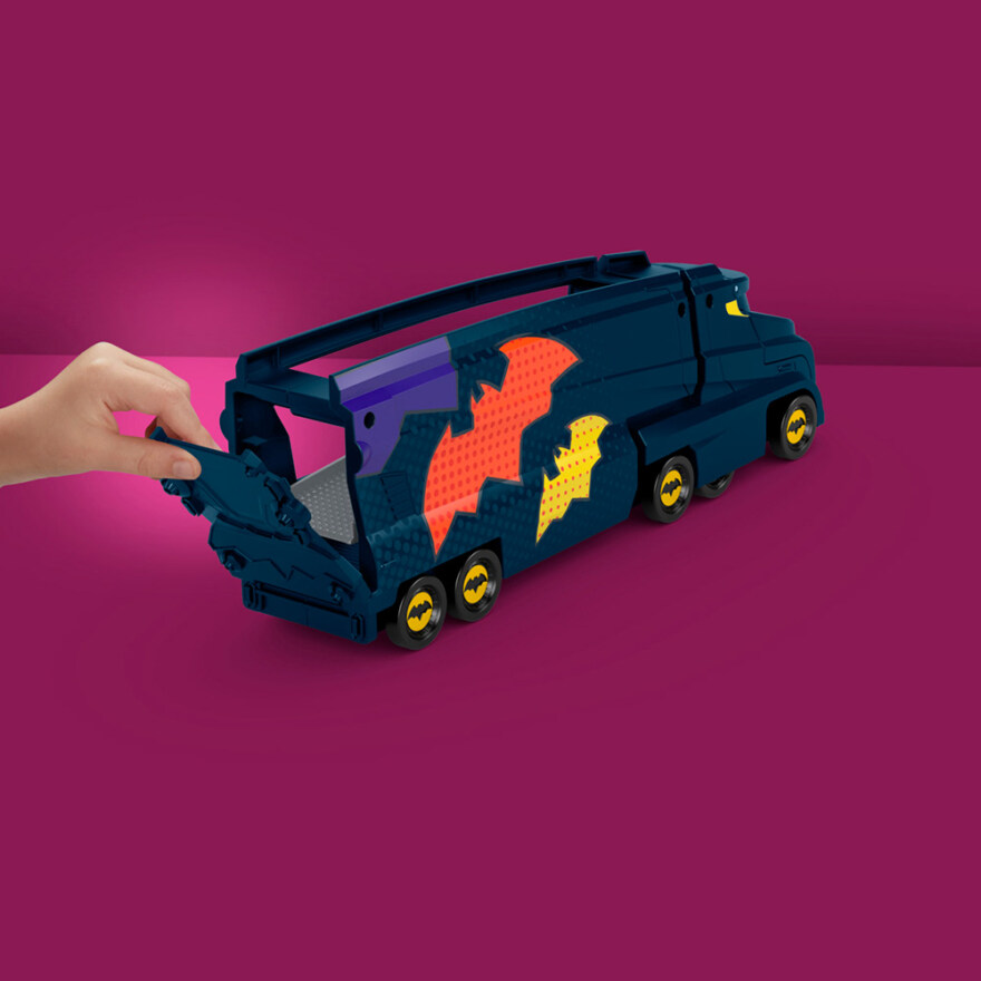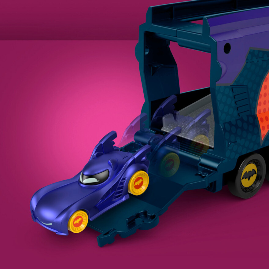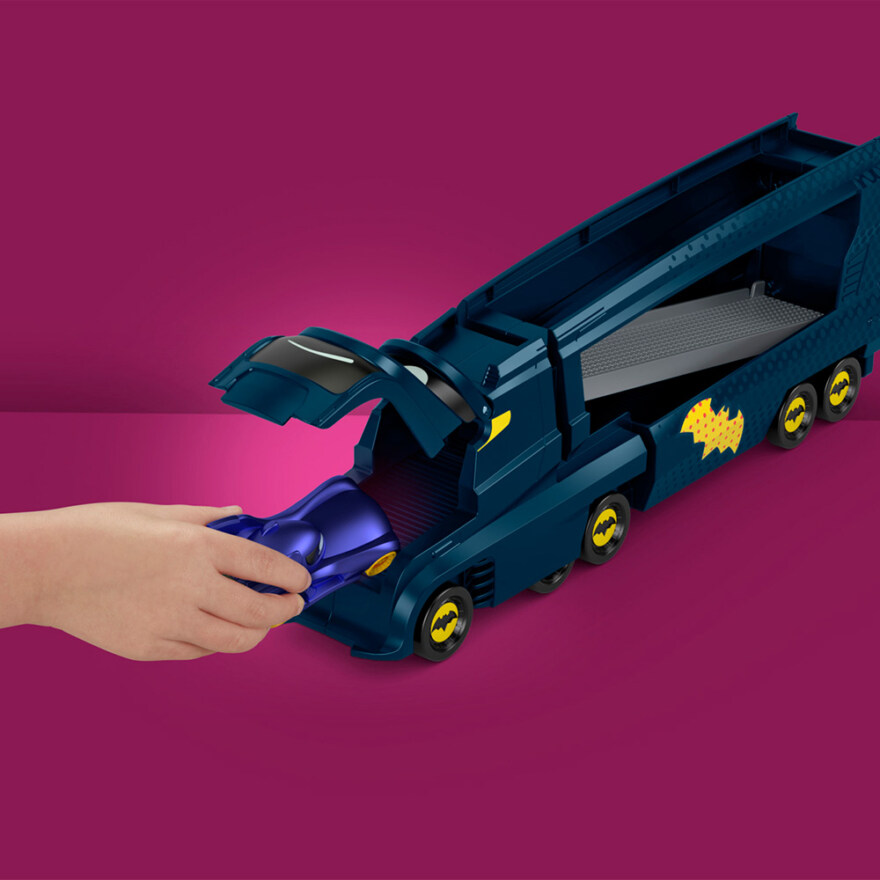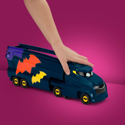 Barnehagebarn kan gjenoppleve noen av favorittøyeblikkene sine fra DCs Batwheels-serie med denne Batwheels™ Bat-Big Rig-biltransporteren fra Fisher-Price®. Transporteren har plass til opptil 7 kjøretøy i målestokk 1 : 55 og leveres med en formstøpt Bam The Batmobile™. Barna kan åpne siden, førerhuset og rampen bak på transporteren for å laste og laste av biler! Barna kan samle på flere Batwheels™-lekebiler i målestokk 1 : 55 og kombinere dem med Bat-Big Rig for mer fartsfylt lek.