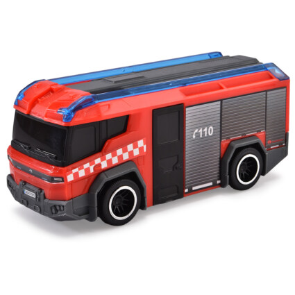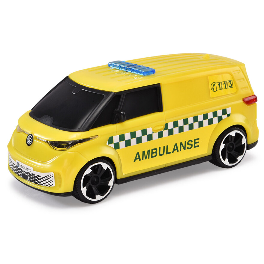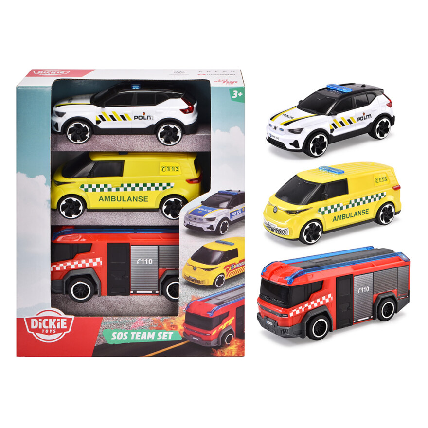 SOS-team fra Dickie Toys med norske redningsbiler, ambulanse, brannbil og politibil, med frihjul.