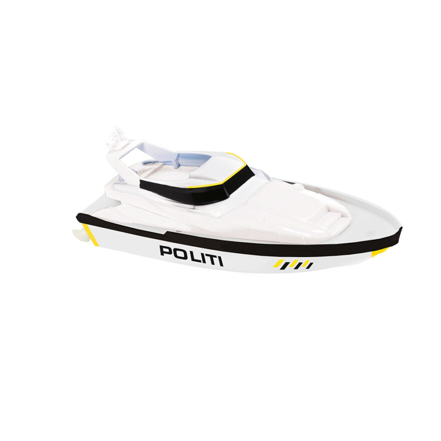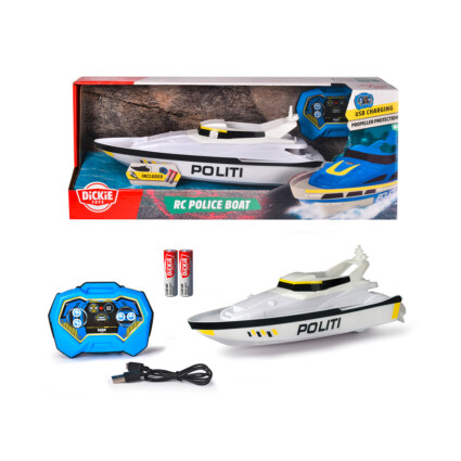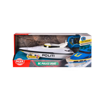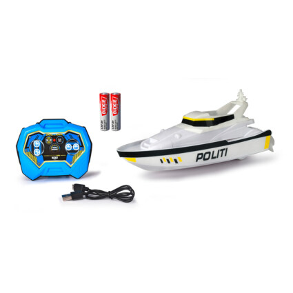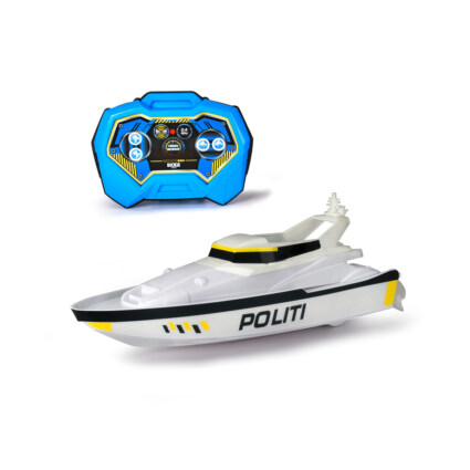 Radiostyrt norsk politibåt fra Dickie Toys - perfekt for lek i badekaret eller innsjøen! Ved utrykning- bare la den solide og vanntette politibåten kjøre ivei på vannet. Politibåten er propelldrevet og har også turbofunksjon, for raskt å komme seg unna og bekjempe kriminalitet. Denne radiostyrte politibåten i norsk versjon fra Dickie Toys har gjennomtenkt teknologi og er den perfekte gaven!
