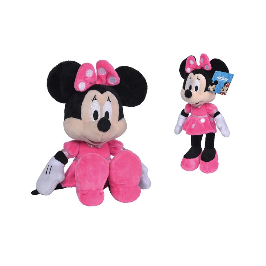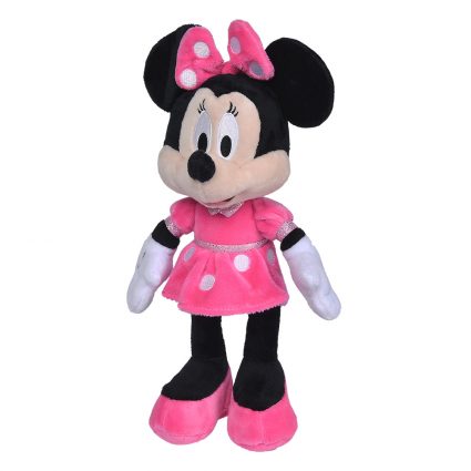 Søt Minni Mus kledd i en fin rosa kjole med prikker og matchende sløyfe. Det myke Disney-kosedyret vil raskt bli en kosete venn hjemme. Lengde: 25 cm.