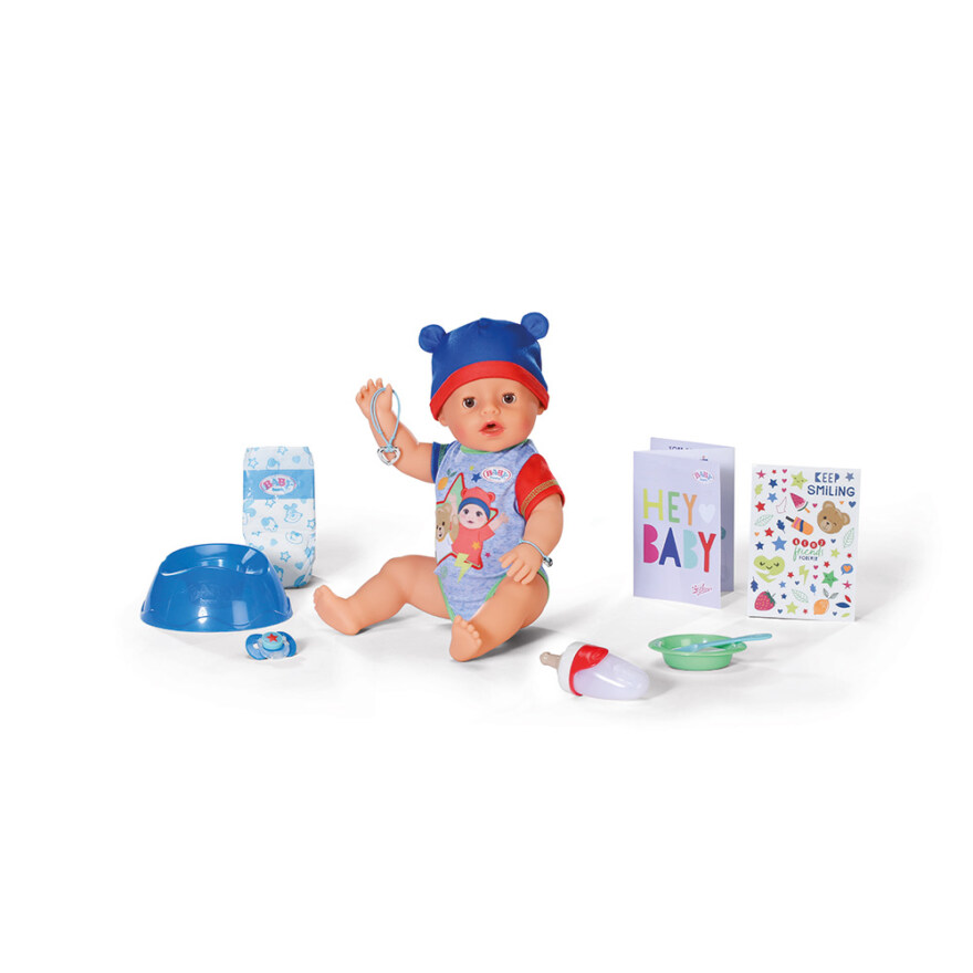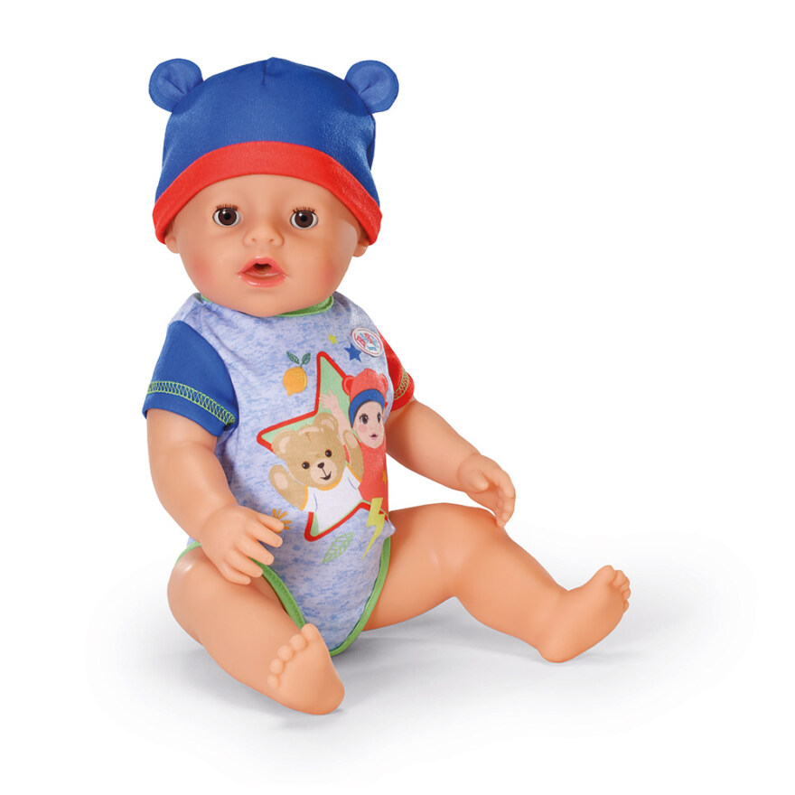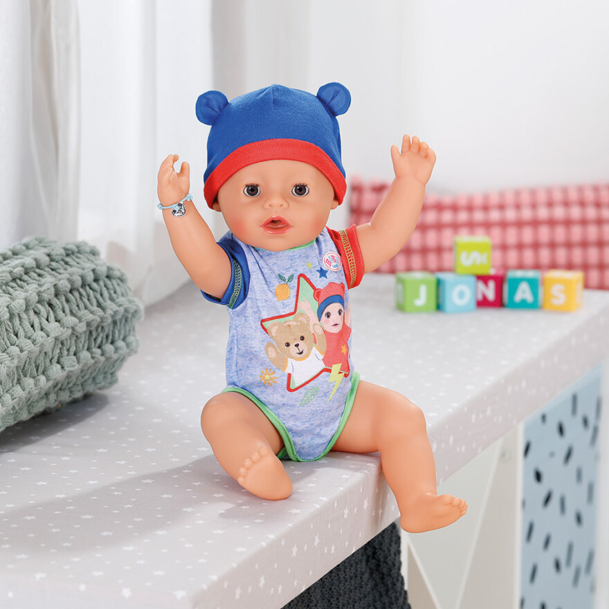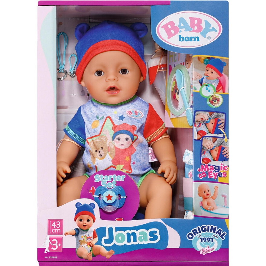 Her kommer Jonas. Han har 10 lekefunksjoner: kan drikke, gråte, spise, skifte bleier og sove på potten, er fullt badbar og super mobil. Et deilig måltid med et søtt ansikt vises i den lille tallerkenen når det kommer i kontakt med vann. Pottet viser også den store og lille virksomheten. Nære øyne ved å vri dummy: Hvis du blir BABY born Jonas 'dummy til venstre, lukker han øynene, og hvis du vender den til høyre, åpner han øynene.