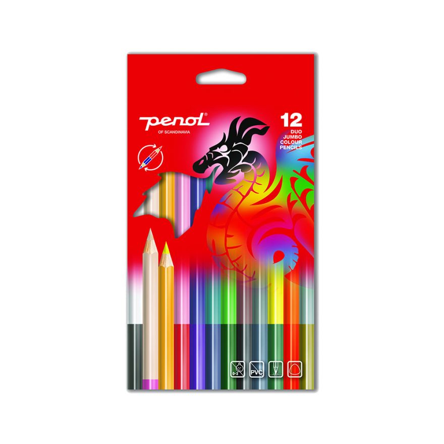 12 tykke fargeblyanter med 2 farger per blyant, totalt 24 farger. Blyet er limt til treet og gjør blyantene enkle å spisse. Penol fargeblyanter er beregnet på barn. Blyantene har rene klare farger. De finnes i flere varianter for både små og store barn. Fargeblyanter er sekskantet og gir et godt grep for små barnehender.