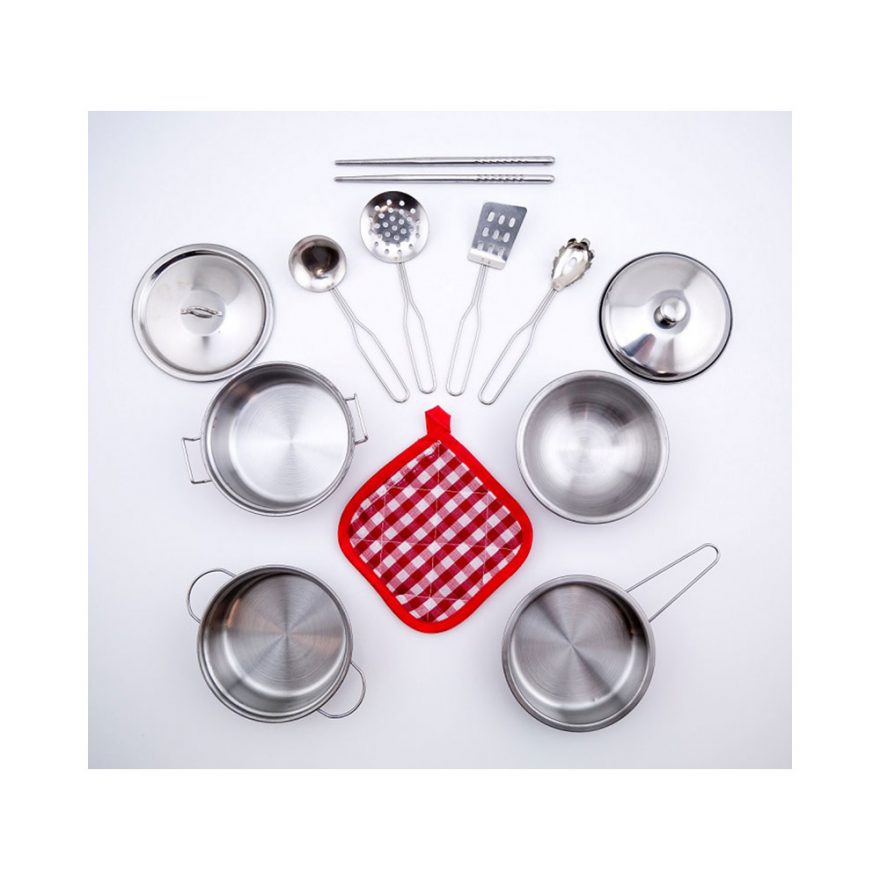 Dette settet inneholder alt barnet trenger for å tilberede morsomme lekemiddager. Det følger med gryter og stekepanne med lokk. Settet inkluderer også 5 kjøkkenredskap til rolleleken.