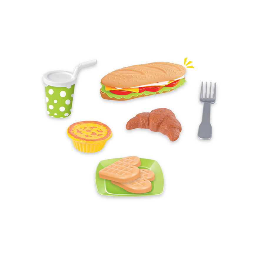 Gjør leketiden smakfull med dette herlige matsettet! Settet inkluderer en baguette, brus, muffins, croissant, vafler, gaffel og tallerken. Perfekt for små kokker som elsker å lage og servere lekemat. La fantasien løpe løpsk med dette morsomme og realistiske matsettet!