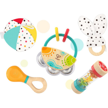 Oppdag Hape 5-i-1 baby sensorisk sett, et fantastisk lekesett som inkluderer tamburin, rangle, ball, ring og regnmaker. Settet hjelper til med å utvikle babyens kjerneferdigheter på en morsom og engasjerende måte.