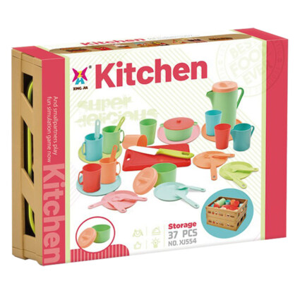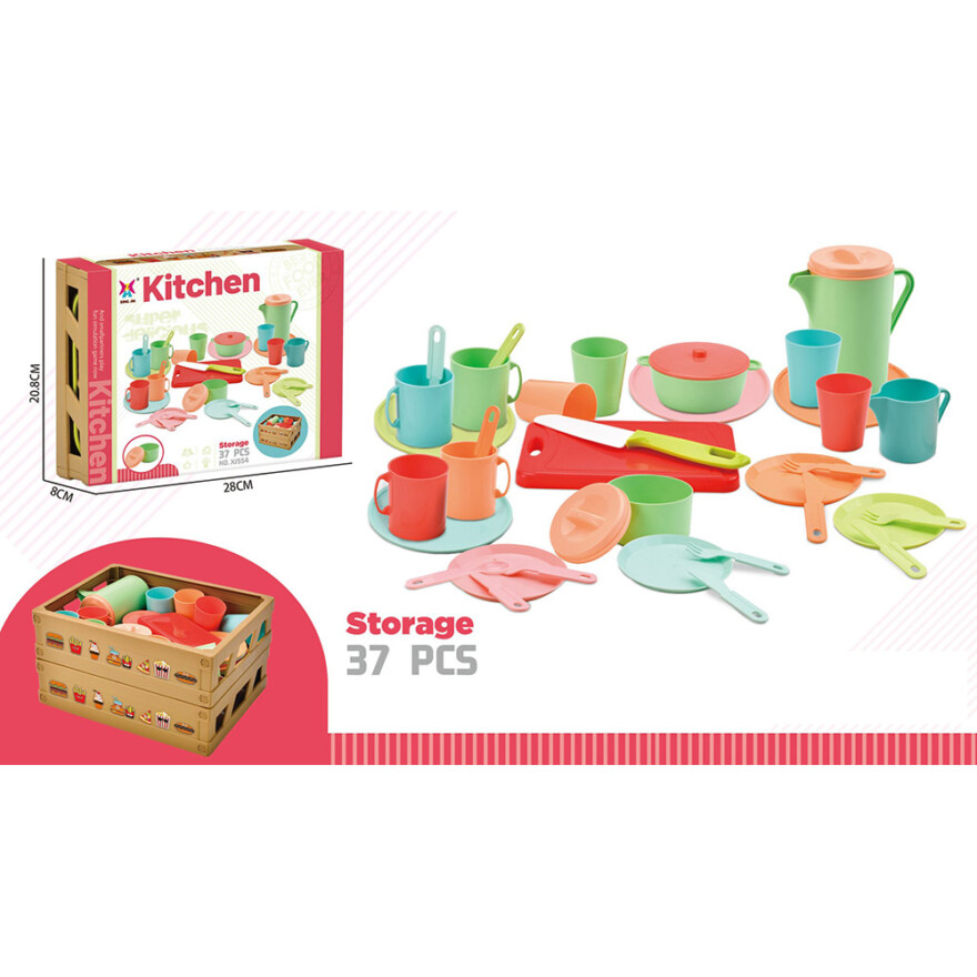 - 37 deler: Inkluderer kniv, kopper, tallerkener, bestikk og annet tilbehør for en komplett lekeopplevelse for små kokker og verter