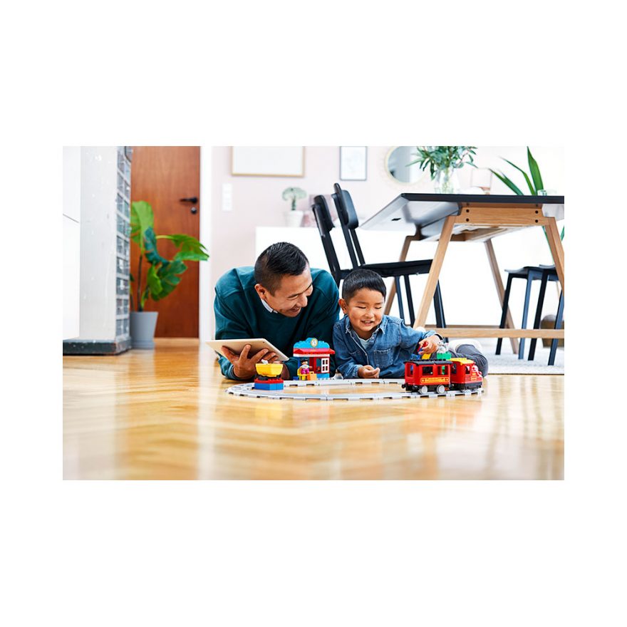 Nå er det enda lettere for småbarn å manøvrere og leke med settet LEGO® DUPLO® 10874 Damptog. Med skyv og slipp-motoren kan de leke togfører. Når barnet skyver toget lett forover eller bakover, tøffer toget av gårde, og når barnet holder toget fast eller løfter det av skinnegangen, stopper toget.