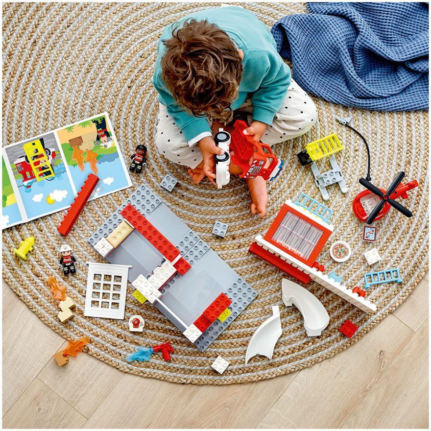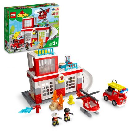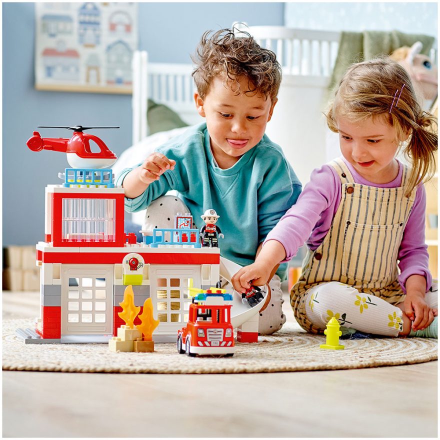 Det er hektisk aktivitet på brannstasjonen! Teamet rutsjer ned sklien, setter seg i Skyv og slipp-brannbilen og kjører ut av den store svingdøren med blinkende lys og påslått sirene. Et helikopter tar av fra taket og flyr til brannstedet. Når jobben er gjort, er det tid for trening og en velfortjent pizzapause før sengen kaller. I morgen blir det nok en travel dag.