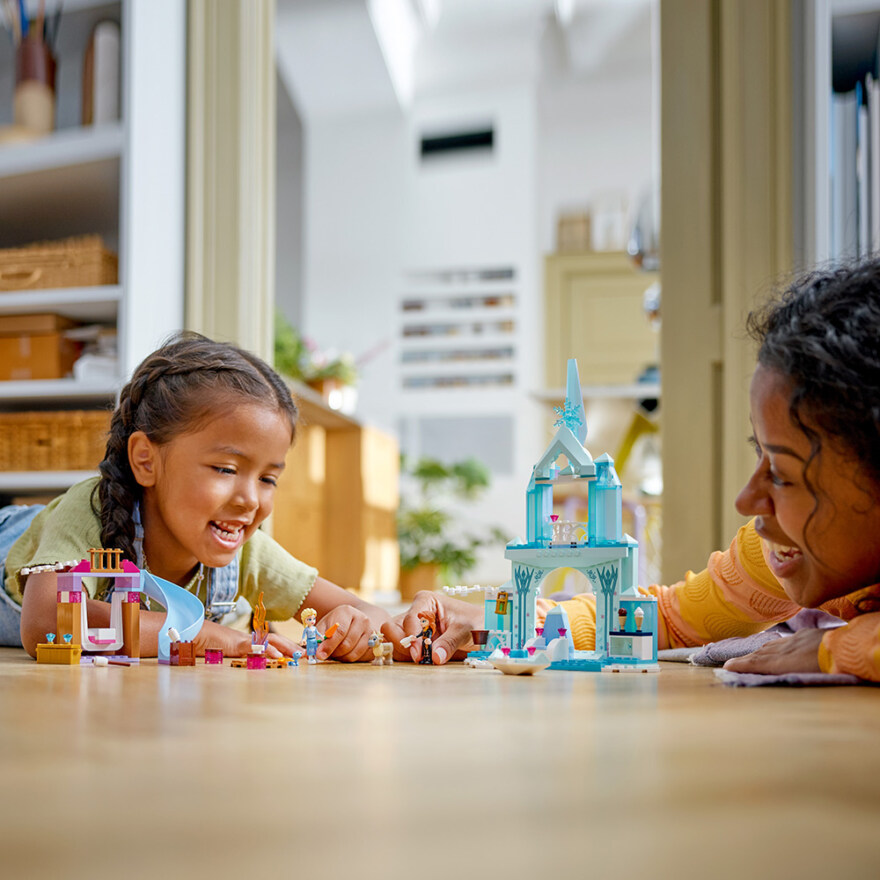 Besøk et slott som er inspirert av den populære Disney-filmen Frost! Utforsk det spennende LEGO® ǀ Disney byggesettet, vink til Elsa på vei til kjøkkenet for å hente deg en iskrem. Sett deg på husken, klatre til topps for å se hva kisten inneholder og skli deretter ned igjen. Sett deg ved bålet sammen med Anna, Elsa, Bruni og en reinsdyrkalv, og grill marshmallows. Nam! Den gøyale venneleken kan fortsette i det uendelige!