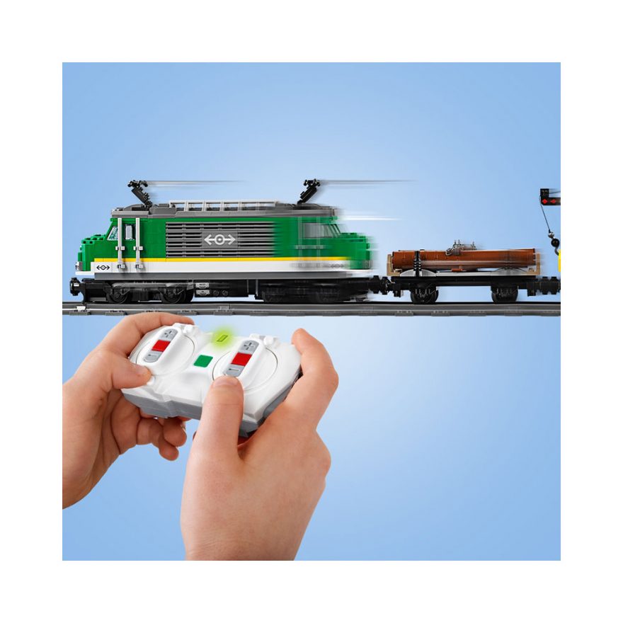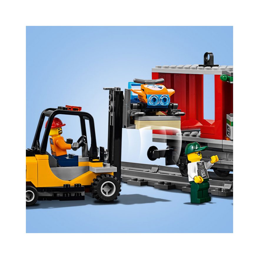 Gjør klar LEGO® City 60198 Godstog, og få fart på godstransporten! Bruk gaffeltrucken for å fylle containerne før du løfter dem opp på godsvognen med kranen. Hekt på alle vognene, klatre om bord i førerhuset, tut med fløyten og rull av gårde! Få lasten fram i tide, og sørg for å holde hjulene i gang i LEGO City!