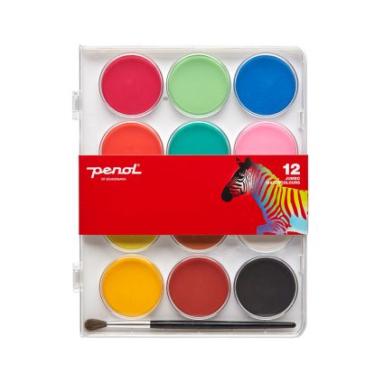 12 jumbo fargetabletter i skrin. Maleskrin fåes i flere størrelser og inneholder klare, dekkende vannfarger. Alle skrin inneholder pensel.