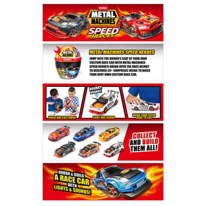 Oppdag Metal Machines Speed Hero, hvor mer enn 20 overraskelser venter inni hjelmen! Når du åpner den, finner du alle delene du trenger for å bygge din helt egen Speed Hero, i tillegg til noen ekstra overraskelser som gir enda mer moro. Med to ulike karosserier og klistremerker kan du sette sammen og tilpasse din egen racerbil slik du vil. Samle alle figurene: Hver Speed Hero kommer med to unike karosserier, så du kan bygge og tilpasse alle seks bilene i serien! Gi liv til din Speed Hero med spennende lys og lydeffekter!
