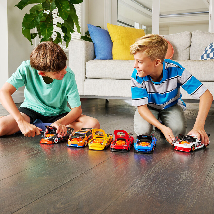 - Samle alle figurene: Bygg og tilpass alle seks bilene i serien