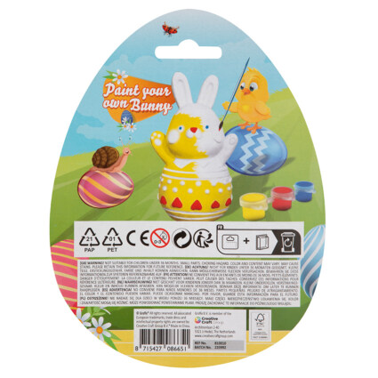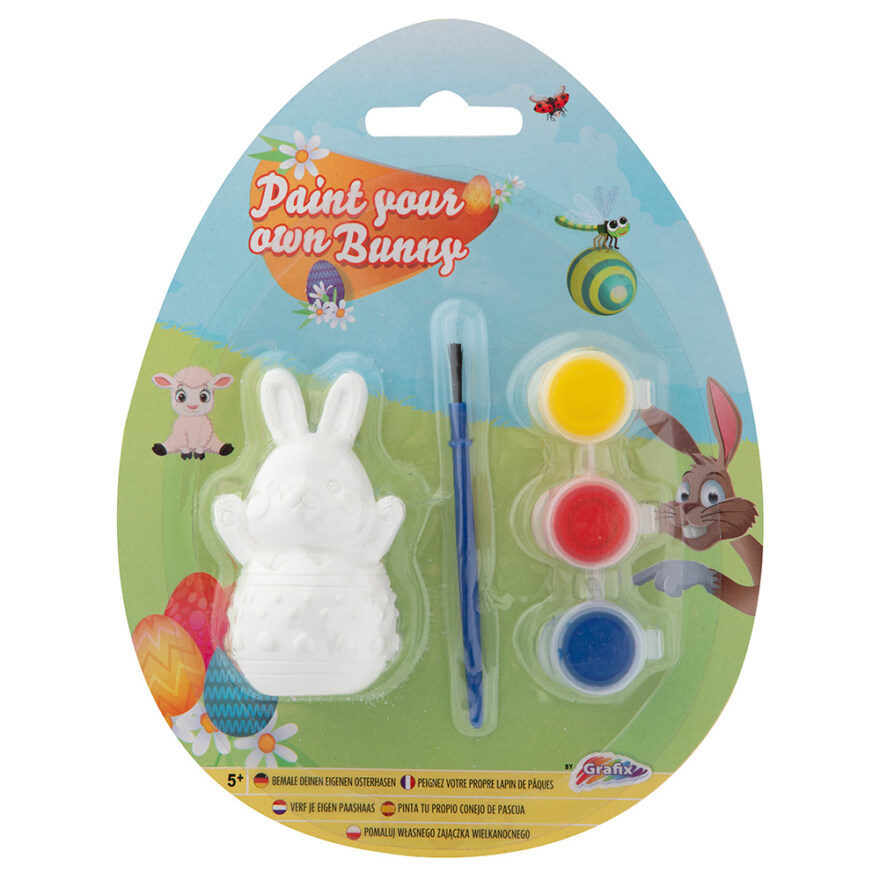 Mal din egen påskehare! Settet inneholder en harefigur i keramikk som du enkelt kan fargelegge med de medfølgende akvarellene og pensel.