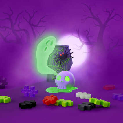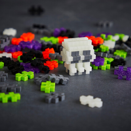 Plus Plus Spooky Mix kan brukes om og om igjen og kommer i et praktisk rør som gjør det enkelt å ta med seg. Dette røret inneholder 240 Plus Plus brikker i fargene glitter lilla, neon oransje, glow in the dark, limegrønn, sort og mørkegrå - en perfekt mix for skumle kreasjoner som spøkelser og gresskar.