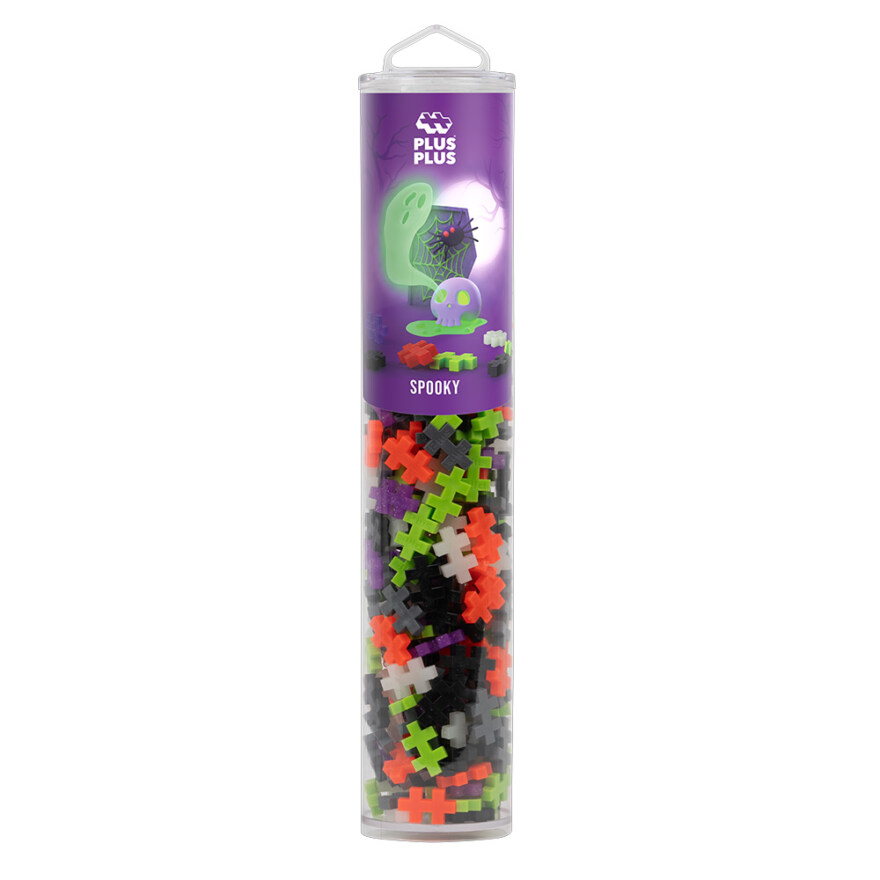 Plus Plus Spooky Mix kan brukes om og om igjen og kommer i et praktisk rør som gjør det enkelt å ta med seg. Dette røret inneholder 240 Plus Plus brikker i fargene glitter lilla, neon oransje, glow in the dark, limegrønn, sort og mørkegrå - en perfekt mix for skumle kreasjoner som spøkelser og gresskar.