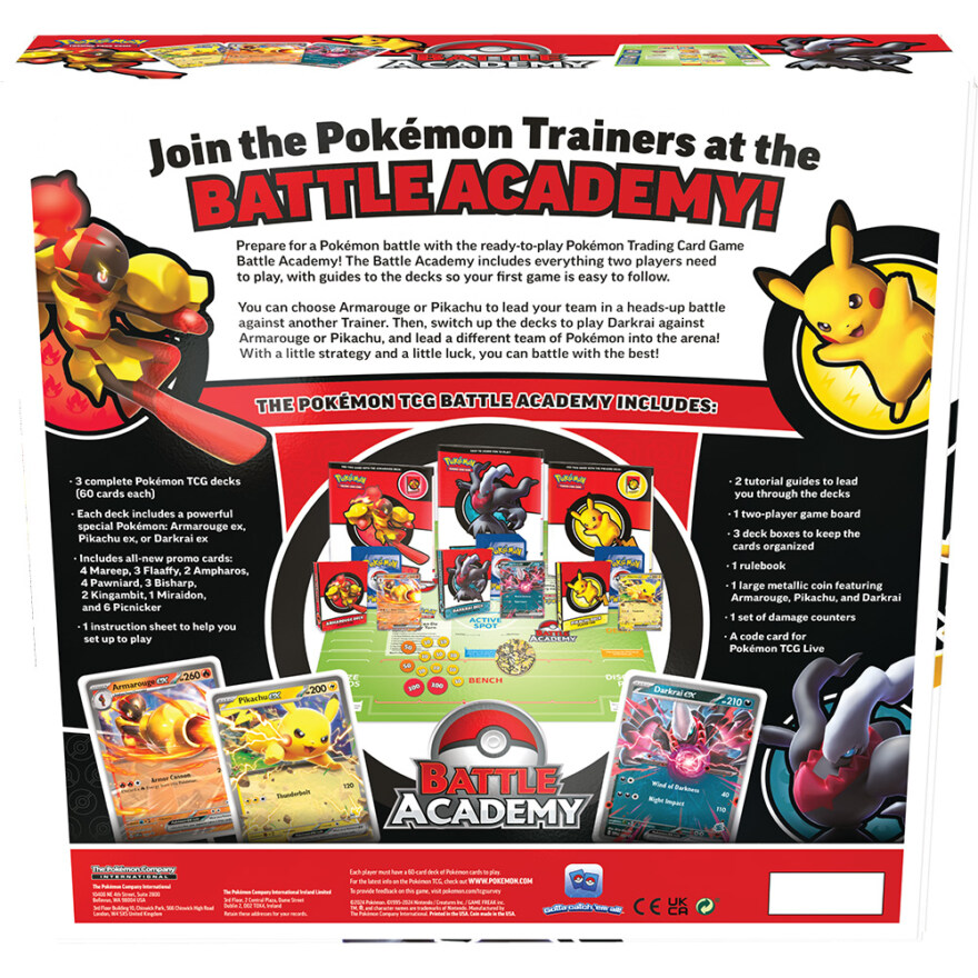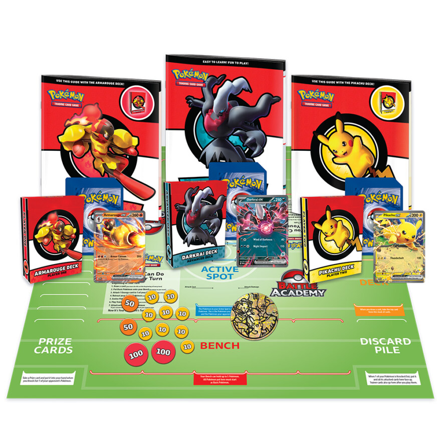 Forbered deg på en Pokémon-kamp med det spilleklare Pokémon Trading Card Game Battle Academy! Battle Academy inkluderer alt to spillere trenger for å spille, med guider til kortstokkene slik at det første spillet ditt er enkelt å følge. Du kan velge Armarouge eller Pikachu for å lede laget ditt i en heads-up-kamp mot en annen trener. Bytt deretter kortstokkene for å spille Darkrai mot Armarouge eller Pikachu, og led et annet lag med Pokémon inn på arenaen! Med litt strategi og litt flaks kan du kjempe mot de beste!