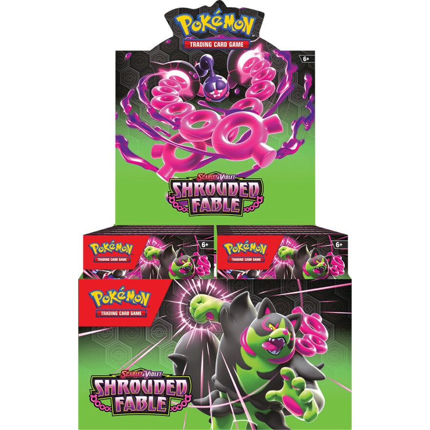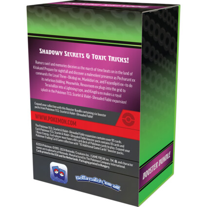 Ryktene svirrer og minner bedrar mens tidens marsj slår videre i landet Kitakami! Forbered deg på mørkets frembrudd og oppdag en ondskapsfull tilstedeværelse når Pecharunt ex befaler den lojale Three-Okidogi ex, Munkidori ex og Fezandipiti ex til å gjøre sitt ondsinnede bud. I mellomtiden kobler Revavroom ex seg til nettet for å Terastallize til en Lightning-type. Og Kingdra ex gjør kongelig splash i Pokémon TCG: Scarlet & Violet - Shrouded Fable-utvidelsen!