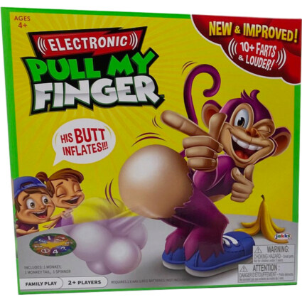 Man vet aldri når den eksploderer! Det nye og forbedret elektroniske Pull My Finger har nå over 10 høyere promper for å gi deg et enda mere spennende og morsomt spill!