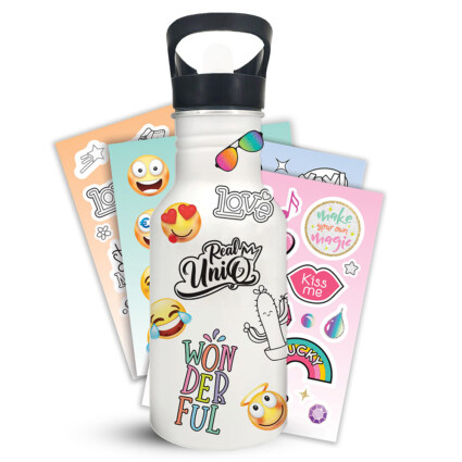 Dekorer vannflasken med de 60+ klistremerkene, hvor noen kan farges før de settes på flasken! Enten flasken er i lommen på sekken eller i pyjamaspartytasken, så er din personlige vannflaske enkel og morsom å ta med på alle eventyr!