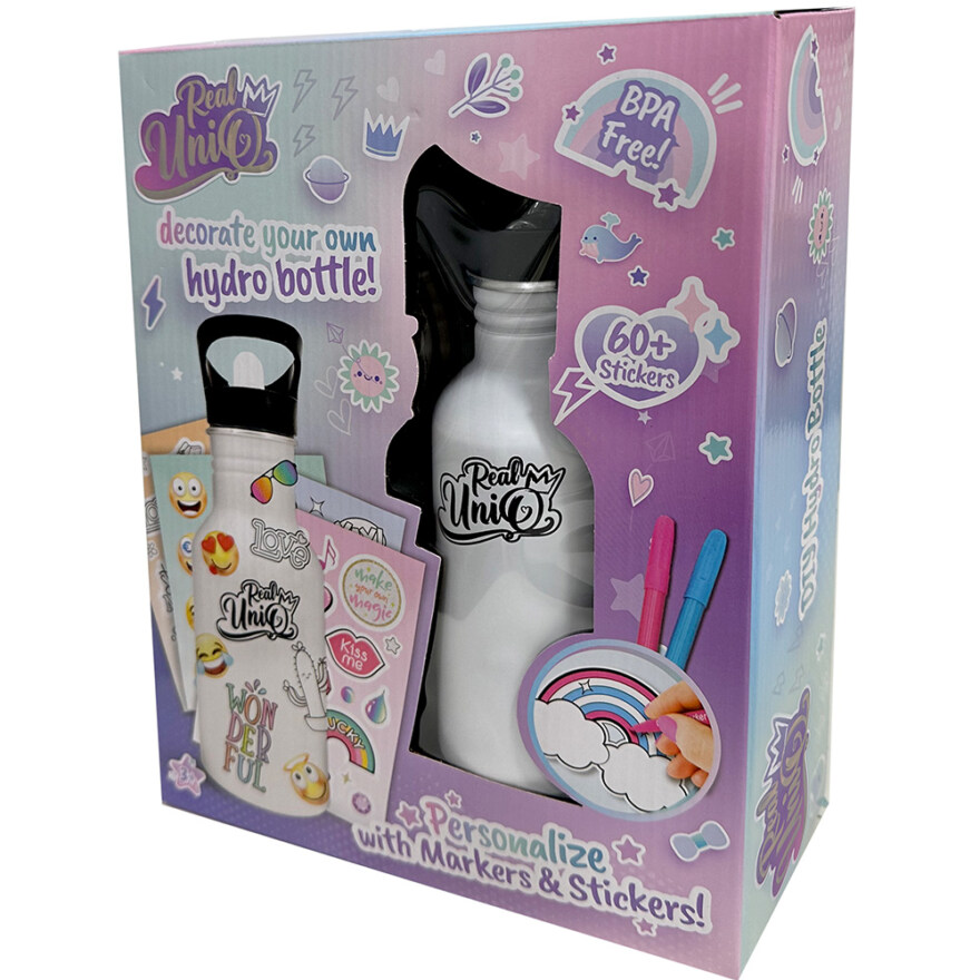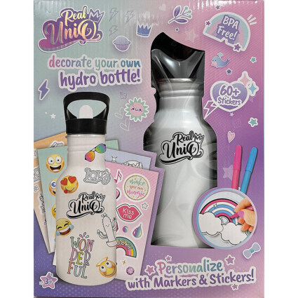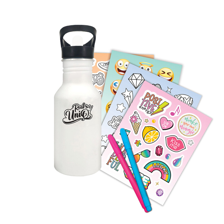 Gjør det mye morsommere å drikke vann med en personlig designet vannflaske fra Real UniQ! Real UniQ Vannflaske DIY-settet inneholder alt du trenger for å lage din helt egen unike vannflaske med et trendy og personlig design. Settet inkluderer fargetusjer i blått og rosa, klistremerkeark og en Real UniQ Premium BPA-fri aluminiumsflaske.