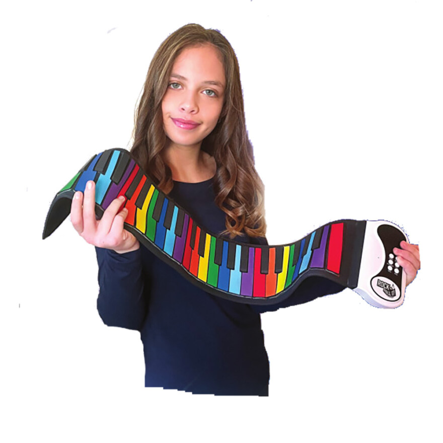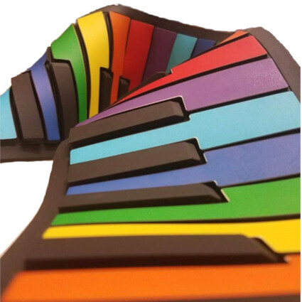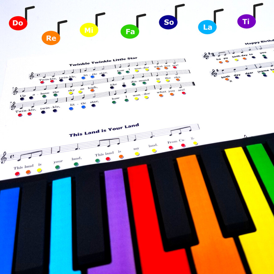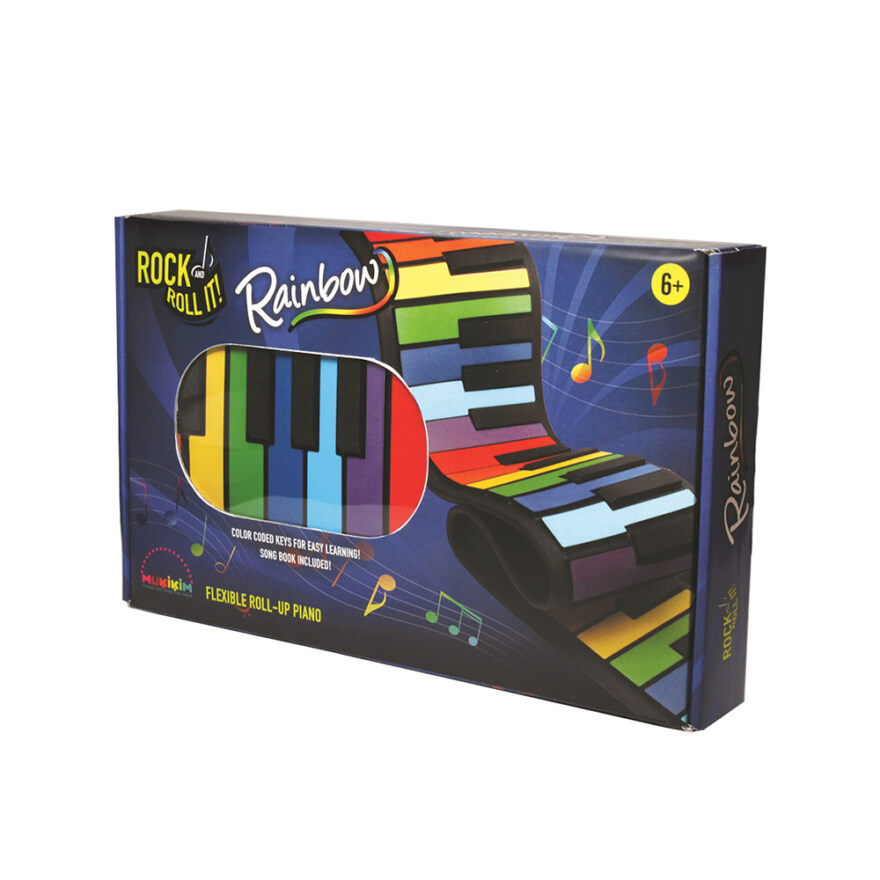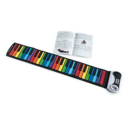 Piano i silikonmatte med mange funksjoner. Du kan enten lytte i hodetelefoner (ikke inkludert) eller bruke den innebygde høyttaleren. Det finnes 6 demosanger, flere ulike piano-og keyboardlyder, volumknapp og innspillingfunksjon. Inkluderer bok med fargekodede melodier og USB-ledning for ladning (stikkontakt er ikke inkludert).