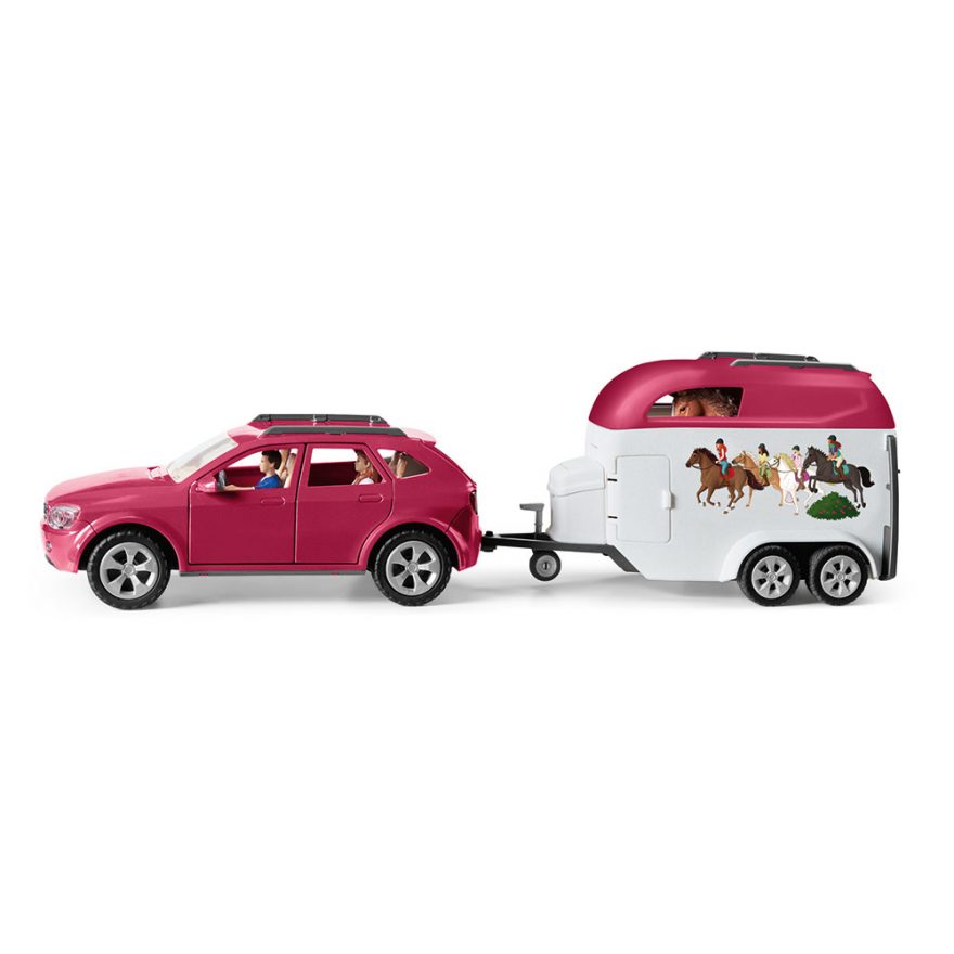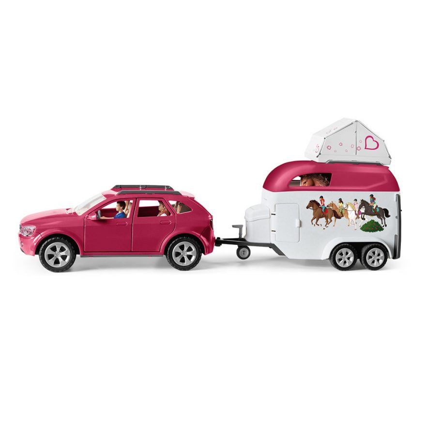 Hannah og faren hennes opplever mange eventyr med Bil og hestetilhenger fra Schleich® Horse Club! Alle funksjonene gir mange forskjellige lekemuligheter. Setene i den romslige SUV-en kan legges ned slik at pappafiguren Mr. Kramer kan laste inn alt de trenger. For eksempel det sammenleggbare teltet og alt rideustyret. Det omfatter både hjelm, sal, seletøy, bøtte og striglekasse med massasjebørste og strigle. Dessuten en stige som kan settes på.