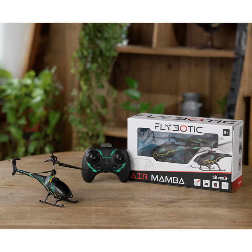 Silverlit Air Mamba er en 2-kanals helikopter som er enkel å fly og passer nybegynnere. Den har et tøft og stilig design, og en innebygd LED-lampe foran. Flybotic Air Mamba er et flott valg for barn som er nysgjerrige på radiostyrte helikoptre. Den har IR-styring og passer til innendørs bruk. Helikopteret har et innebygd batteri som lades enkelt med den medfølgende USB-kabelen.