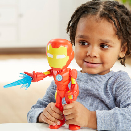 Iron Man til unnsetning! Med en høyde på 23 cm er denne storstilte poserbare superheltfiguren stor, vennlig og klar til å spille! Barn kan feste det medfølgende Repulsor Ray-tilbehøret til figurens håndledd og flytte Iron Man-figurens hode og armer til morsomme actionpositurer.
