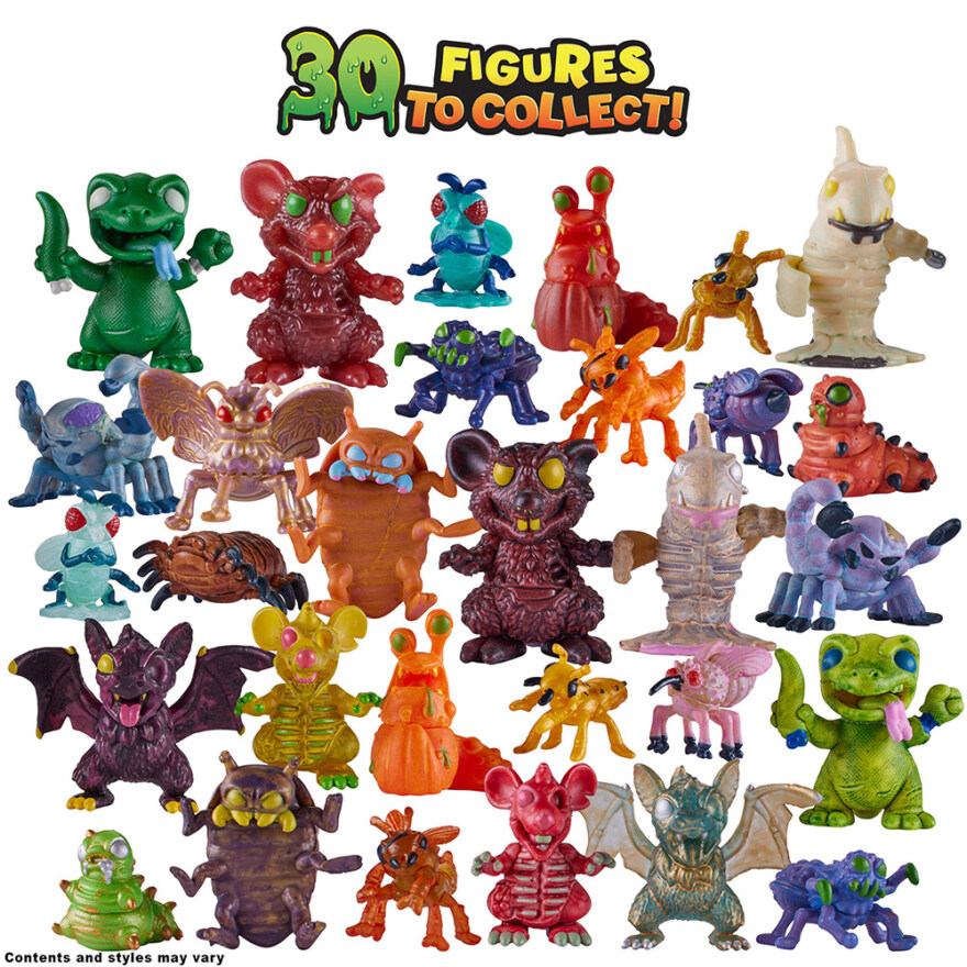 Pakk ut 3 forskjellige ekle komponenter (en snacks, en dipp og en pose med stinkende slim) og 2 bisarre figurer.