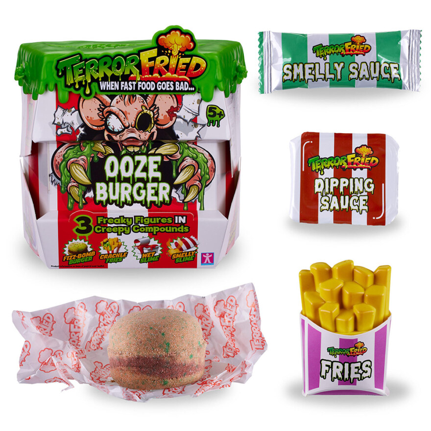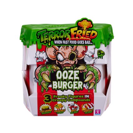Åpne den klassiske burgeren og pommes fritesene - Terror Fried-stil! Ooze Burger-måltidet inkluderer brusende burger og sprakende pommes frites. Senk burgeren ned i vann for en brusende avsløring. Knus deretter pommes fritesene og åpne opp dyppesausene for flere grusomme overraskelser. Terror Fried Ooze Burger leveres i fastfood-stil kartong og inkluderer et samlekort.