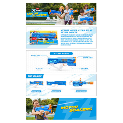 Gjør deg klar til å regjere over sommerens vannkamper med XSHOT Water Fast Fill Motor Soaker! Denne motoriserte blasteren fylles opp på bare 1 sekund, noe som gjør den ustoppelig i vannkamper.